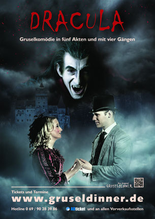 Ein Abend mit Biss - Herzlich willkommen in der Gruft von Graf Dracula! Begleitet von seinem verrückten Gehilfen Renfield, werden Sie Zeuge, wie der Fürst der Finsternis von seinem Schloss in den Karpaten aus nach London reist, um sich nach vielen Jahren der Einsamkeit eine neue Braut zu suchen. Dracula hat es auf Mina Murray, die Verlobte des Immobilienmaklers Jonathan Harker abgesehen. Doch seine ärgste Widersacherin, die Vampirjägerin Sadie van Helsing, hat sich bereits auf seine Fersen geheftet. In dieser rasanten Geschichte begleiten Sie Dracula in das verrufene Nachtlokal „Rote Höhle“, unterziehen sich den Vampirtests von van Helsing und bangen um die schöne Mina. Ein guter Rat: Passen Sie auf Ihren Hals auf ... Erleben Sie einen unvergesslichen Abend mit dem Original Gruseldinner! Genießen Sie schaurig-schöne Stunden und gönnen Sie sich ein Theatererlebnis der besonderen Art. Zwischen den Szenen werden Sie mit einem delikaten Vier-Gang-Menü verwöhnt. Es erwartet Sie eine unheimlich humorvolle Mischung aus Dinner und Theater. Auch für schwache Nerven bestens geeignet!