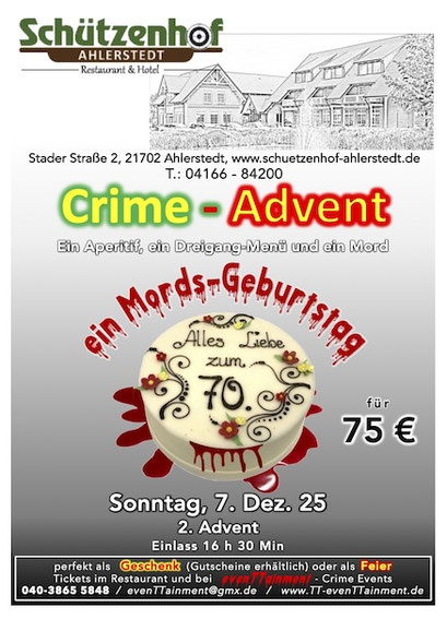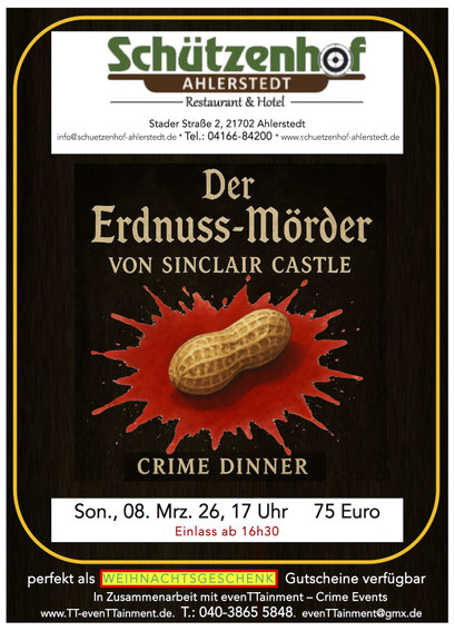 Sonntag, 08.03.2026 Krimi Dinner "Der Erdnussmörder" 75,00€ p.P. Krimikomödie inkl. 3 Gänge Menü